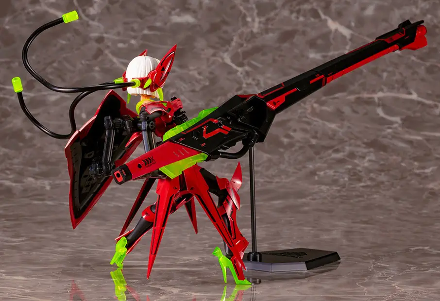 Kotobukiya’s “Megami Device” figure kit of Bullet Knights Launcher Hell Blaze is back! This version of Bullet Knights Launcher is molded in vibrant new colors and comes with new decals, too! The green parts are made of clear material; her long launcher and huge shield are held by an arm extending from her back. A base to support the weapon is also included. Her massive launcher can be transformed into a vehicle that she can ride on, too! The tube extending from the back of her head is made of soft lead for posability. You can display her in “armed mode” wearing her knight-inspired armor, or “base mode” without the armor. She comes with three prepainted faces, and the amazing range of motion of her “Machinica” body allows her to hold her weapons and even sit in a very natural way! The 3mm-diameter ports also allow her to use existing “M.S.G,” “Frame Arms,” “Frame Arms Girl,” and “Hexa Gear” series weapons and accessories. Order her today!