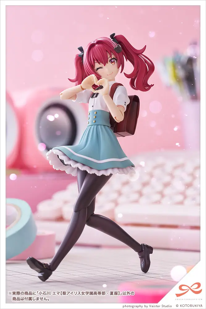 Emma Koishikawa joins the “Sousai Shojo Teien” figure-kit lineup from Kotobukiya! She’ll be fully posable after assembly; her trademark loose and fluffy wave hairstyle has been divided into more than ten parts for a realistic look. You can also display her with twin tails or a twin bun hairstyle! Interchangeable bangs parts are included to display her with or without a headband, as well as with or without hair accessories and glasses. Four prepainted facial expressions are included: a smile, a shout, a screaming tantrum face, and a nervous expression; unpainted versions are also included, as are decals. Emma is a petite and slender girl, and she’s the smallest figure in this series at 14cm tall; her legs are sculpted in a smaller size to match her height, and her shoes can be removed. The ball joint in her neck slides back and forth for a wide range of expressions, and you can use a 6mm-diameter ball joint compatible with “Megami Device” figures to use the body with heads from that series! Eleven interchangeable hands are included, and she comes with three types of skirts: a regular skirt, a fluttering skirt, and one made especially for sitting poses. A special torso part is included that allows her to twist her waist and thrust her right arm forward, too! An additional body is also included to display her sitting in a deep squat. She’s equipped with a tablet PC and a pen tablet, and her smartphone is also included in both normal and gaming mode! She comes with the St. Iris Gakuen Girls’ High School bag, too, as well as five hair accessories. Order her for your own collection today!