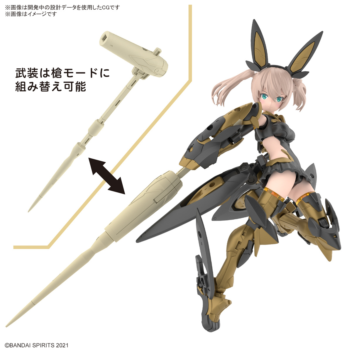 Tukirna-Diearth (Innocente Form) is the newest member of the “30 Minutes Sisters” (30MS) figure-kit lineup from Bandai! This model kit is an all-in-one item that includes a character body, three types of interchangeable faces with tampo printing, and armor parts. The runner parts are arranged in an optimal manner for smooth and easy assembly. The armament can be rearranged from its hammer-like mode to a spear mode. The small head and body are divided into upper and lower parts, allowing for super-expressive posing. Her twin tails have ball joints at the bases for movabiity, and a rabbit-ears headband made of multiple parts is also included! Two different skirts are included: a normal one and one with a flipped hem so it won’t interfere with her legs during action poses. Joint parts using light-concentrating resin are included. She can of course be combined with any of the face, hairstyle, and body parts in the “30 Minutes Sisters” lineup, and since she uses the 3mm-diameter shaft common to Bandai’s “30 Minutes” series, she can use parts from the “30 Minutes Mission” lineup too! Order her for your own collection today!