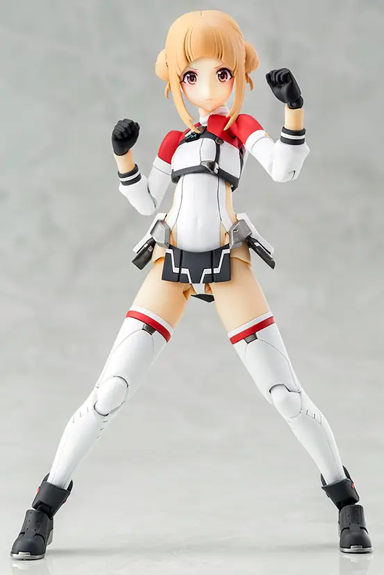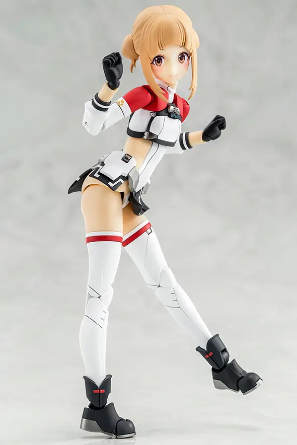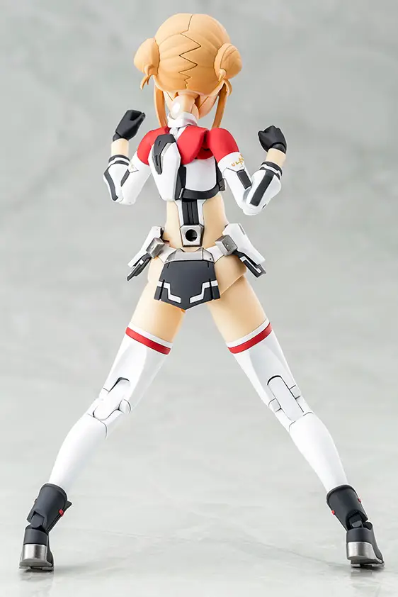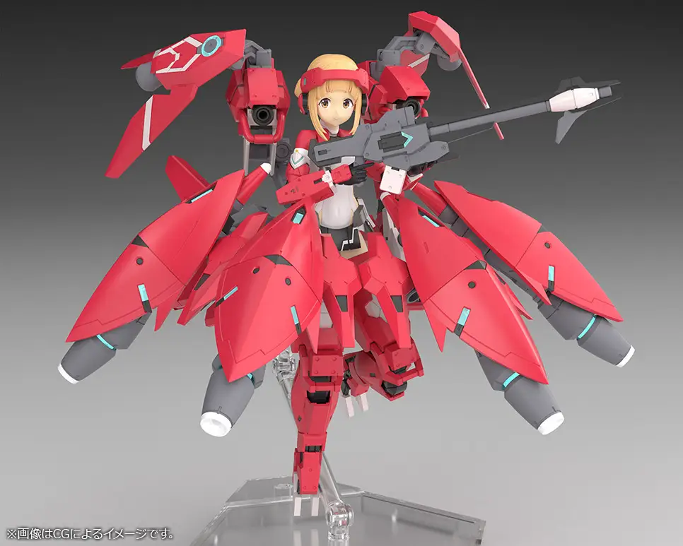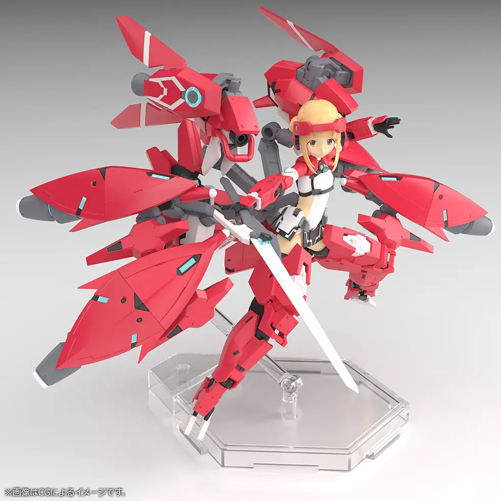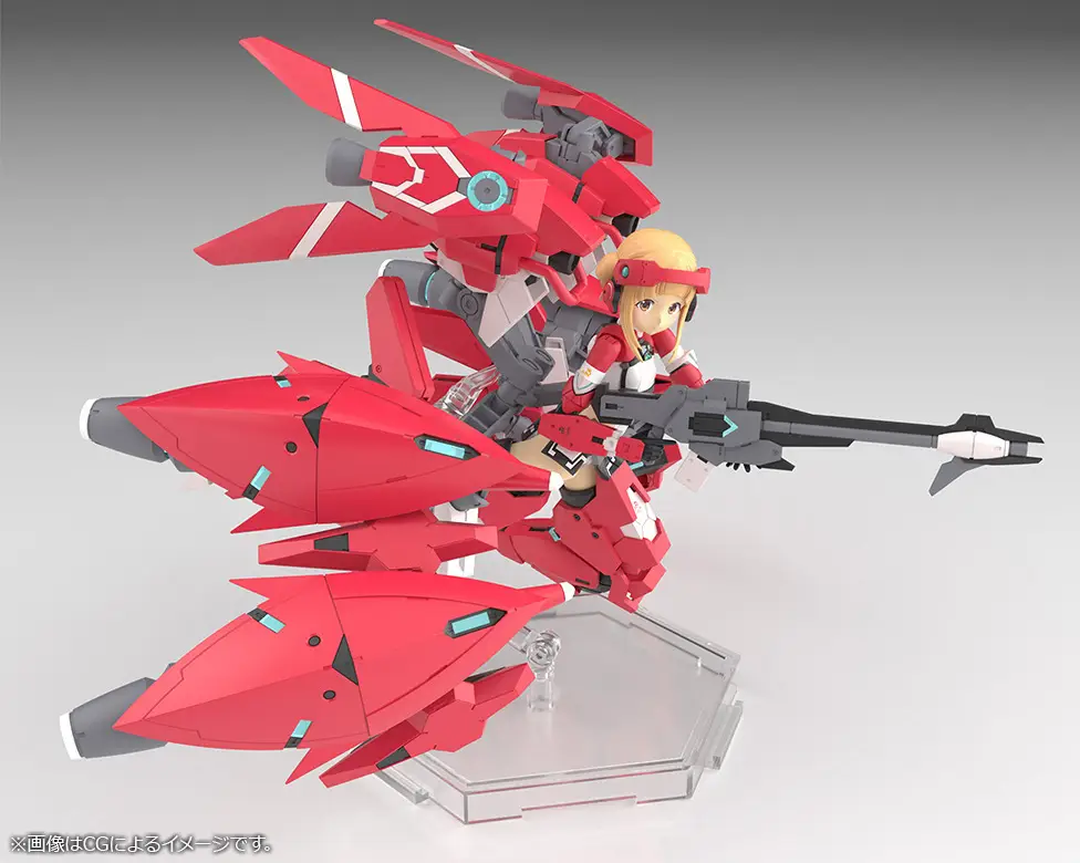Here comes a new collaboration between the anime “Alice Gear Aegis Expansion” and Kotobukiya’s “Megami Device” model-kit series! The anime’s original character Takahata Nodoka {Shimon) is now joining the “Megami Device” lineup! The character design is by Rikiya Okano with design cooperation from Fumikane Shimada, and the design of the suit and gear is by Kanetake Ebikawa! The complex color scheme of the massive equipment she wears is reproduced as much as possible with parts division so it’ll look great even without painting. A rifle, a two-handed sword, and other equipment are included. A special gift code for use in the game is included, as are three interchangeable pre-painted faces. Her costume is newly sculpted, and the thrusters and head gear of the lower gear are partially newly molded. She can be displayed in Armed Mode equipped with her special gear, and also in Body Mode without the gear. The 3mm joints and head compatibility mean you can use existing “M.S.G,” “Frame Arms,” “Frame Arms Girl,” “Hexa Gear,” “Sousai Shojo Teien” and “Arcanadia” parts, too. Decals for her eyes and markings are included, and she also comes with a New Flying Base for display! Order her for your own collection today!