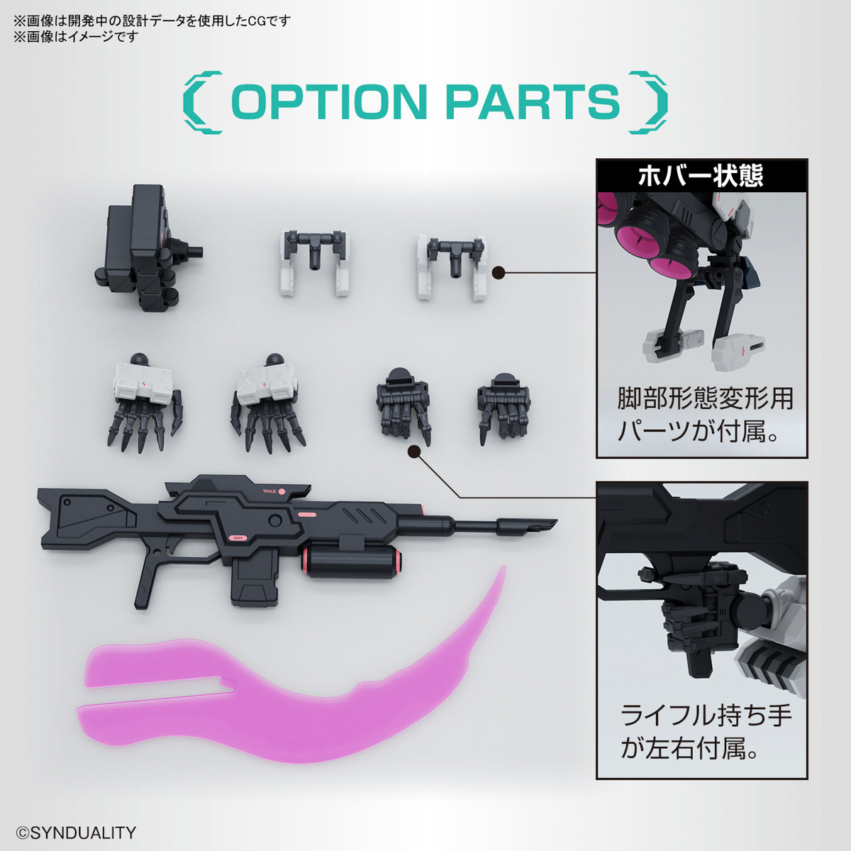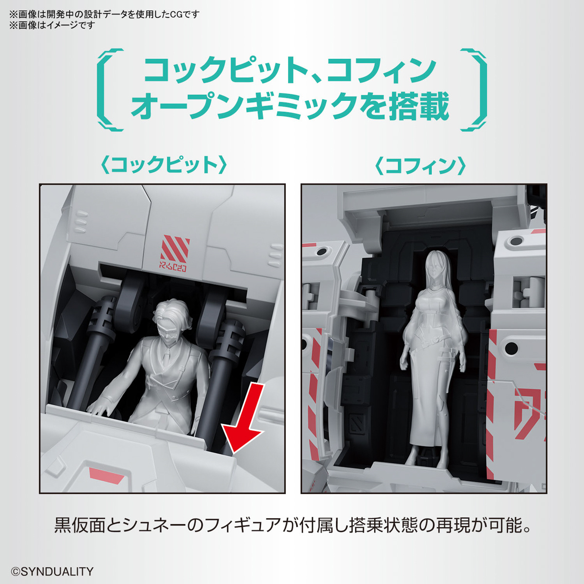 The Gilbow from the upcoming TV anime “Synduality,” exploring the theme of “passing” between humans and AI, is now part of Bandai’s HG model-kit lineup! Piloted by the mysterious Black Mask, the Gilbow is equipped with its characteristic weapons and various gimmicks. The cockpit and coffin are modeled in detail, and equipped with slide and opening gimmicks; figures of Black Mask and Schnee are included. The Energy Impact Blade and Missile Pod on the arms can be deployed, and multiple axes of movement are built into its uniquely designed legs. Parts to transform the legs to reproduce the hovering state are included too, and a display base and stickers are also included. Order yours today!
