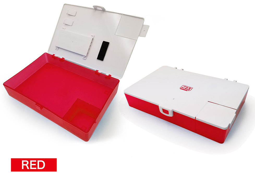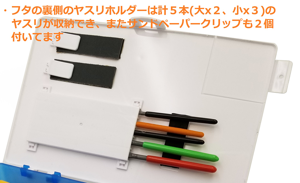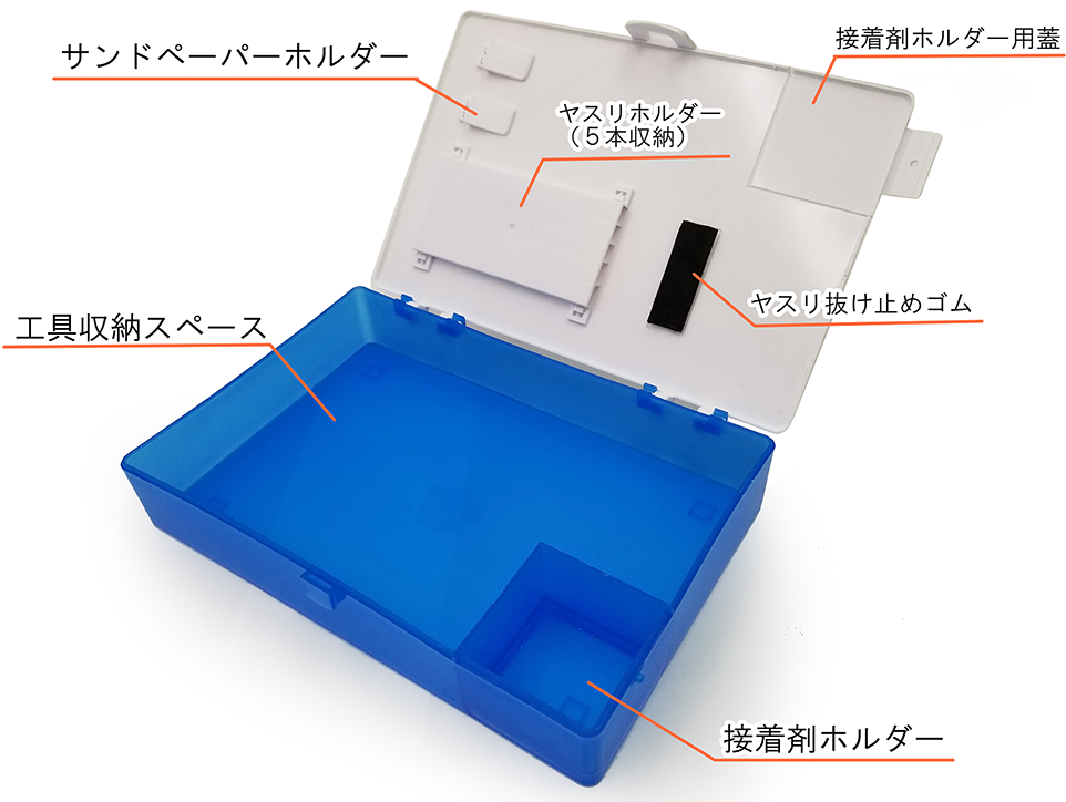 This plastic tool case, in blue with a white lid, snaps securely shut, and features room for your nippers, cutter knives, and so forth.
